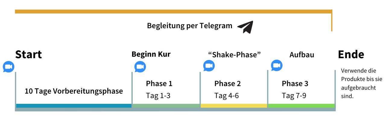 Du bestellst als erstes die für die Kur nötigen Produkte. Der Höhepunkt der Kur ist in drei Phasen aufgeteilt, welche jeweils drei Tage dauern. Vorab nehmen wir uns 10 Tage Zeit um uns langsam auf die Kur vorzubereiten. Jede Phase startet mit einem Zoom-Call (je nachdem Live oder als Aufzeichnung) indem wir dir alles über die kommende Phase nochmal detailliert erklären. Ausserdem findest du zu jedem einzelnen Tag praktische Checklisten und Videos in den Tages-Lektionen des Kurses.